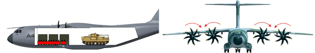 The A400M has a range of over 2,000 nautical miles, with a load capacity of 25 tonnes and is designed to carry large vehicles such as, helicopters, tanks, equipment and personnel. The aircraft also has the capacity to fly almost twice as fast and further than its predecessor.